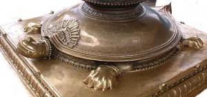 The tortoise, by withdrawing the body parts into its shell gives a message – the core message of Raja Yoga to practice pratyahara (withdrawal of senses) in order to remember our real Self. In South Indian temples you can see this message in the form of a tall, lamp stand emerging from the top of a tortoise’s statue. The light from within shines through when you control your senses as symbolized by the above mentioned lamp stand.
