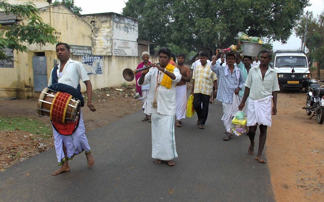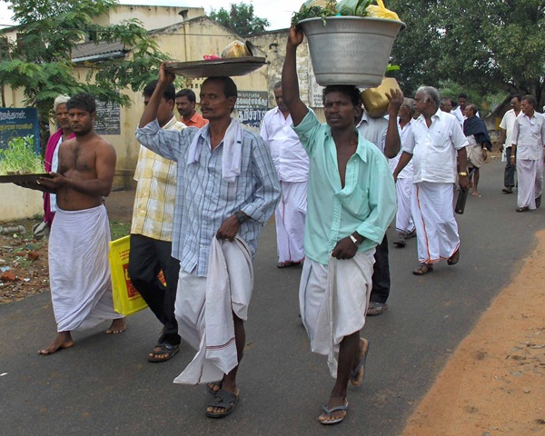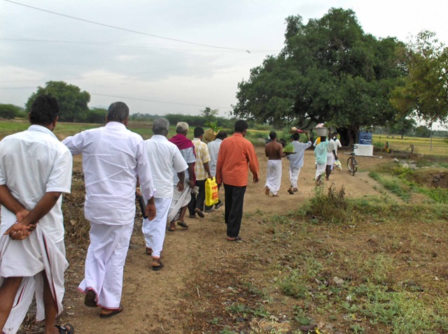 This ceremony requires different music than the drumming of the first day. A horn and drum create different sounds and rhythms than previously. The the musicians start playing and the village men, with male relatives of Mother, go in procession to the village temple, carrying the puja items that will be used there. Anna carries young plants that will be planted at the site of Mother’s ashes.