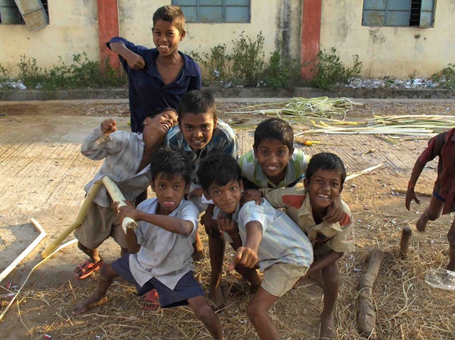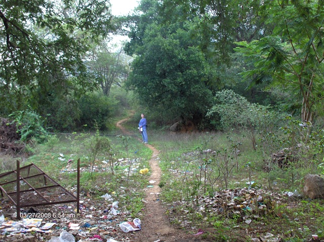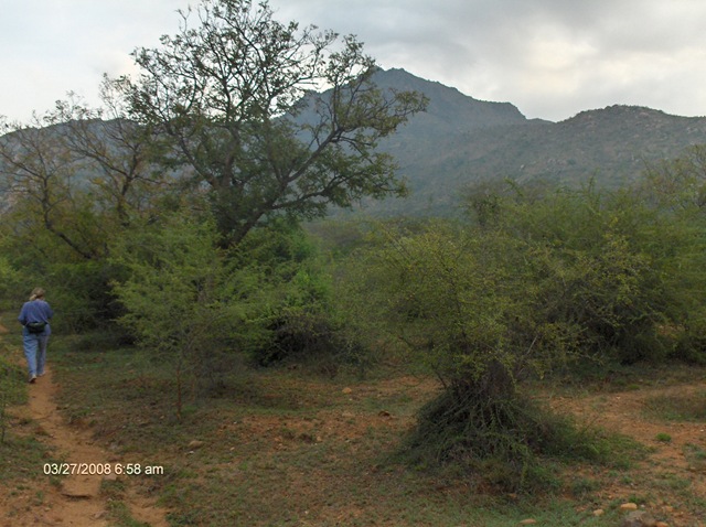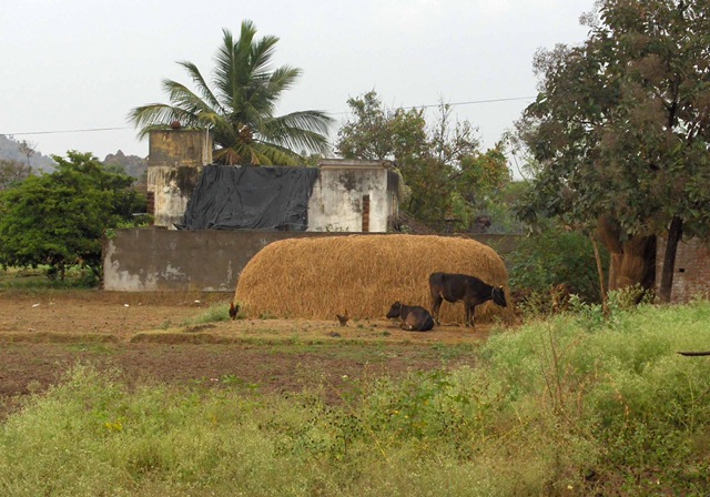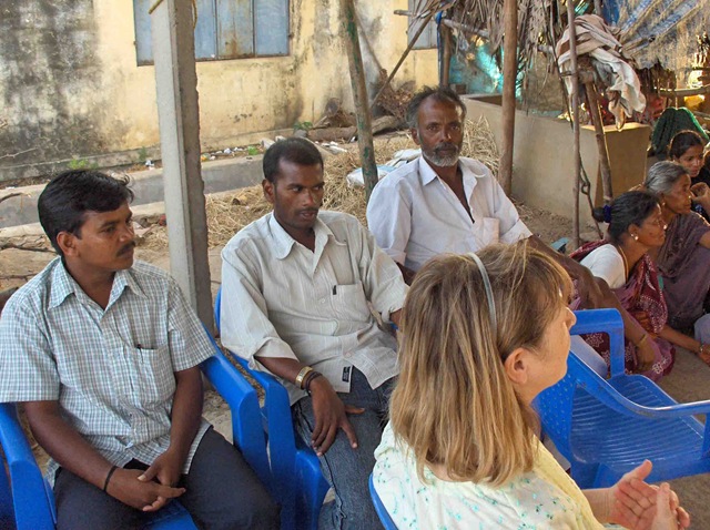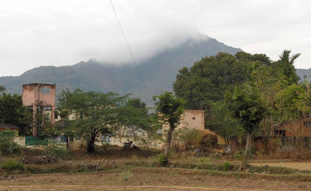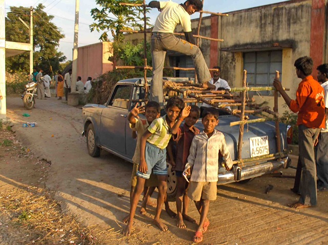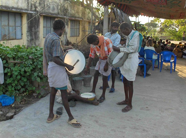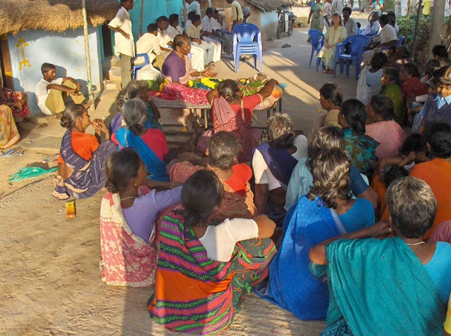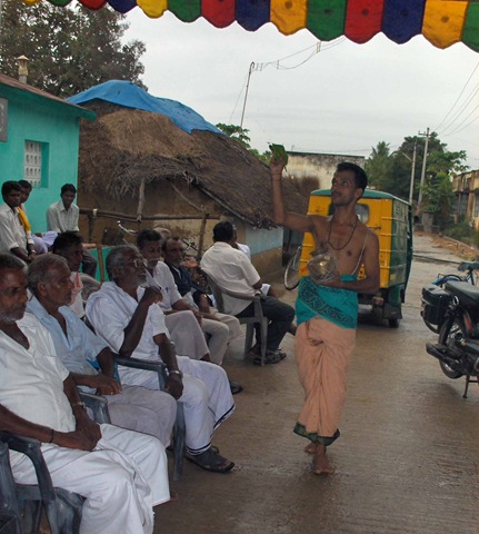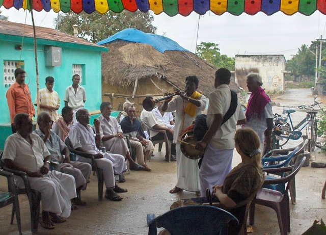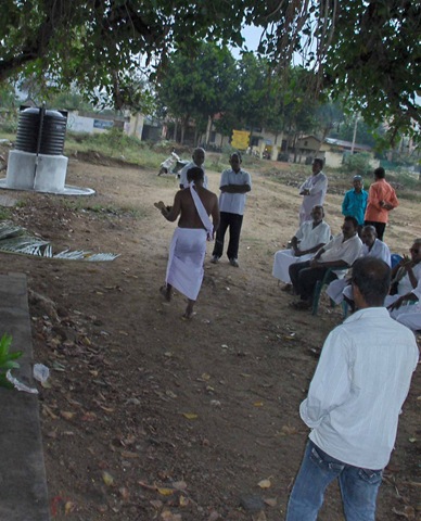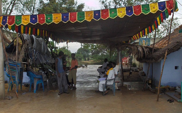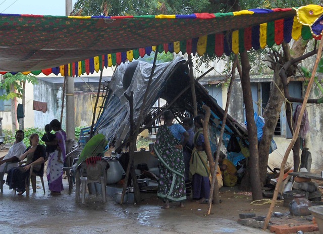 After this, everyone walked back to the village and sat under the canopy and ate the meal that had been prepared all morning by the village women. It was a pretty typical South India lunch, served on a banana leaf. Rice and sambar, fritters, rasam and buttermilk, with a small serving of sour lemon pickle. Since this was a special occasion several side dishes were also given, none of which I could identify.