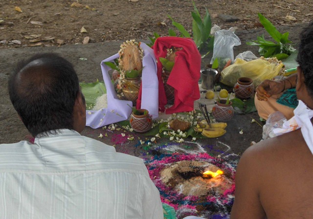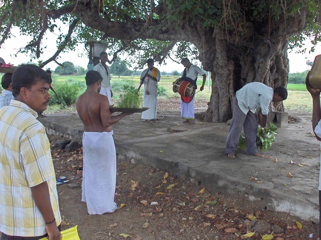 Then it seemed like a ceremonial meal was offered to the mother. While the puja was going on, a man was weaving a coconut fronds. He formed these into a triangular structure, and put it on the ground in front of the tree-temple. Puja items were put into it, and about six banana leaf plates loaded with food were put in front of this. The sons offered camphor to it, and then they (and a few others) walked pradakshina, circling this structure three times.