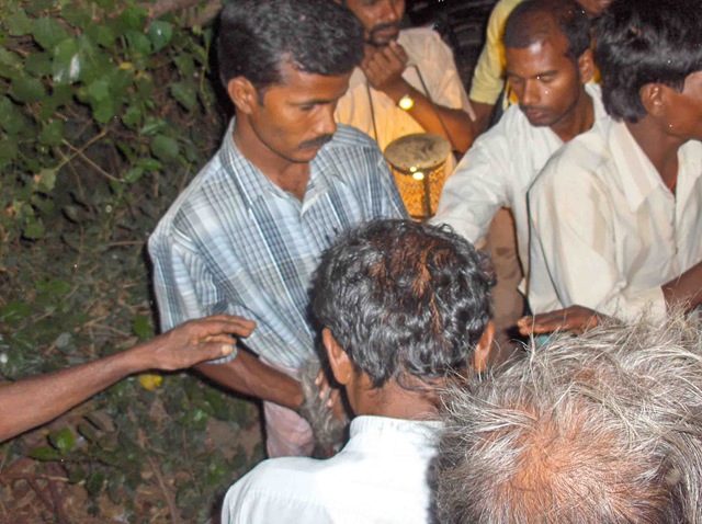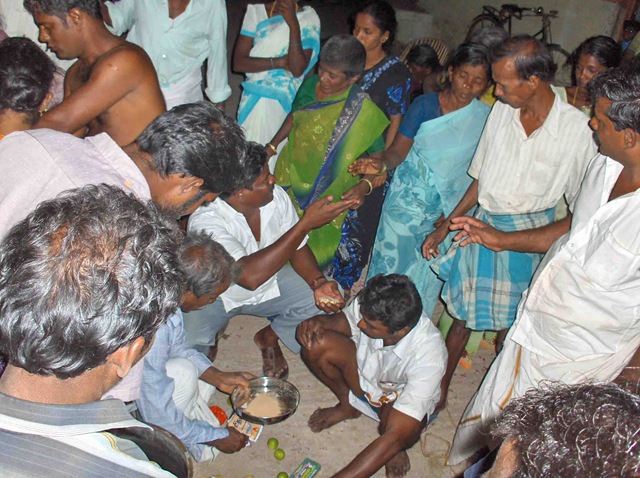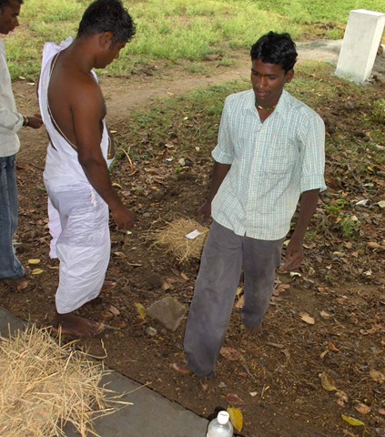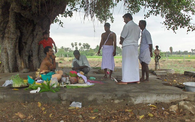After the sons went into the field with the rice for the crows, the village women joined the men at the tree temple. A different ‘altar’ was set up with small inverted ceramic pots holding up a bowl. There were two pots, containing honey and milk, with sticks in them. Some men and women would dip sticks into the pots and then offer these into the bowl. When this was finished, the sons and the priest came over to the bowl for further puja. The sons sat, and the priest placed their outreached hands, with the younger son’s hand above the elder son’s, which was in turn above the bowl. The priest then poured various things, such as water, milk, turmeric, and kum kum, through their hands into the bowl.