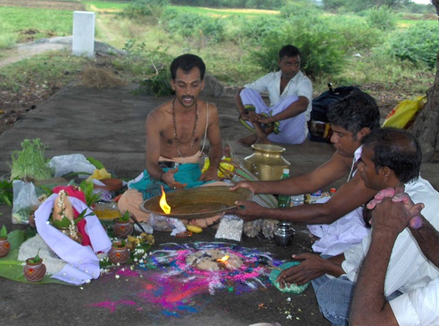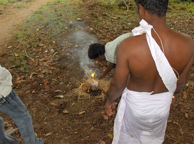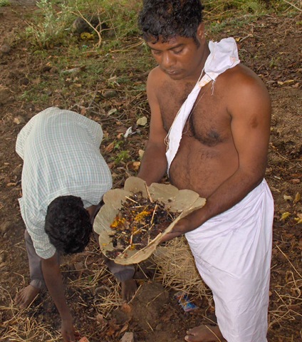 Then a small symbolic white cloth, set into a wooden frame, is placed on a bed of dry plant material on the ground, and burnt. This invokes Booma, Earth Mother. These ashes resulting from this burning are mixed with other holy materials, and carried by Anna to a nearby tank.