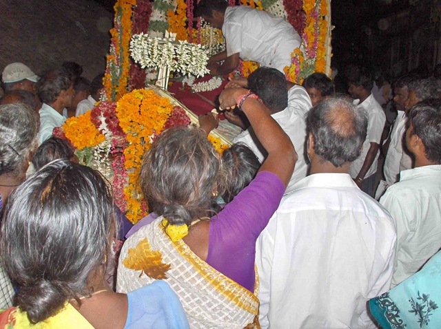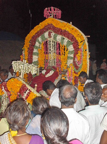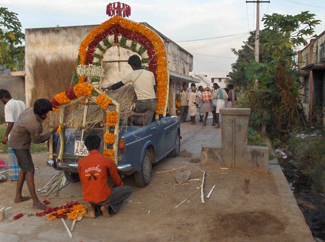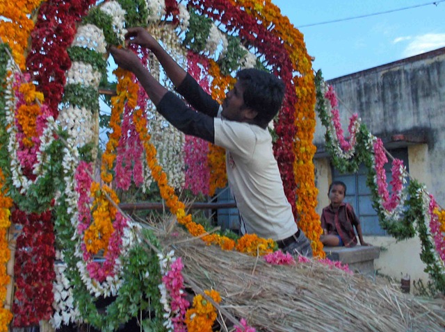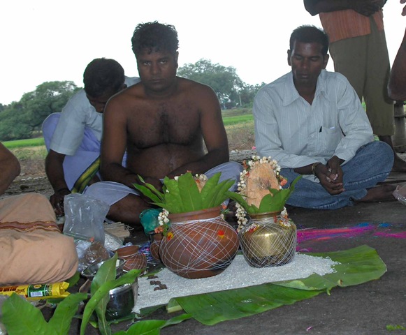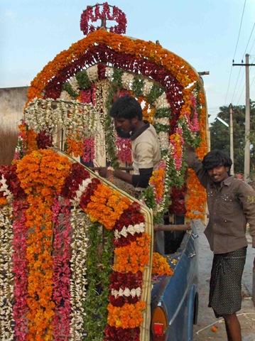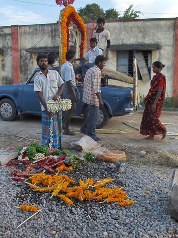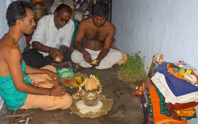 First a puja is offered for Mother inside her house. The Brahmin priest builds an altar, starting with a banana leaf, then a bed of uncooked rice. He prepares a pot by winding string around it, then placing water in it. Leave are put in the pot, then a coconut. The coconut is decorated with flowers. The first son, “Anna,” and another male relative start the puja. They will offer flowers by tossing them to the altar, and then Anna offers camphor to the altar, then to his mother.