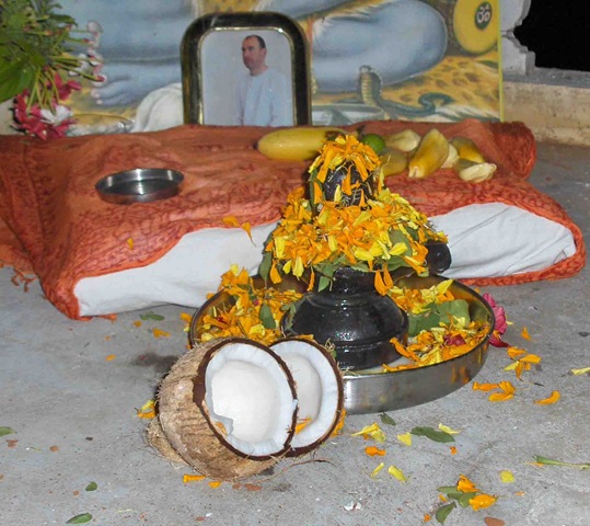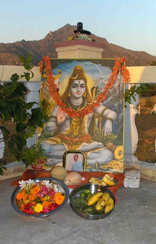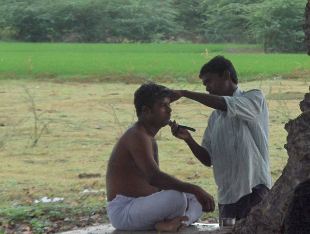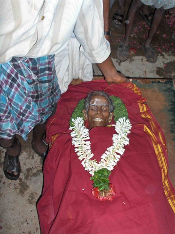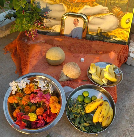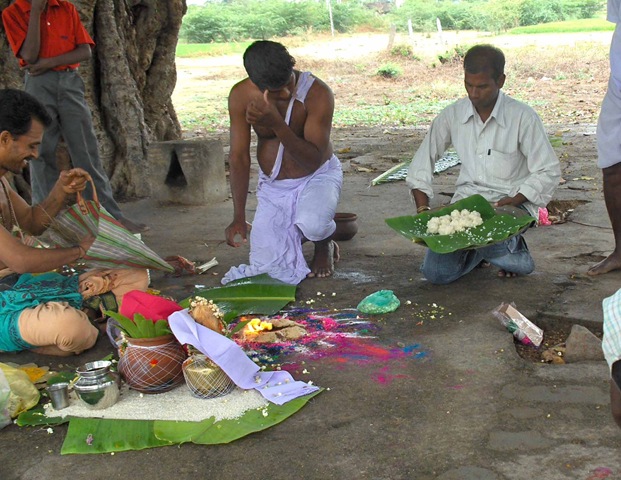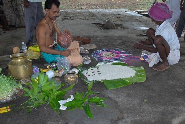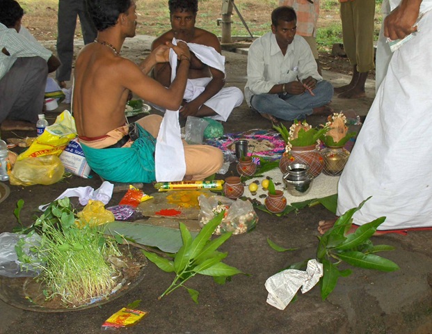 Now preparations for the puja begins. Anna is shaved of all facial hair. He has not shaved since the death of his mother. The priest and a villager work together to lay out the puja items. The specific items used depend first on whether it was a man or a woman, and if a woman, depending on whether her husband survives her, or she is a widow. This is a puja is for a widow.