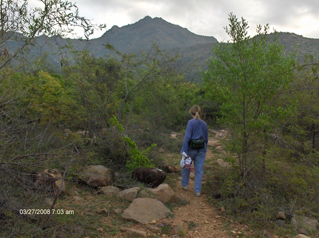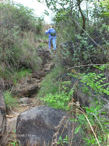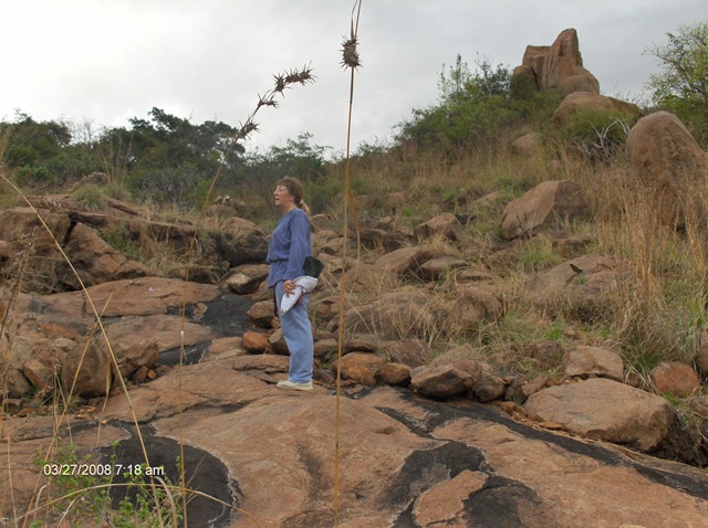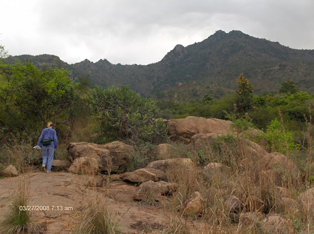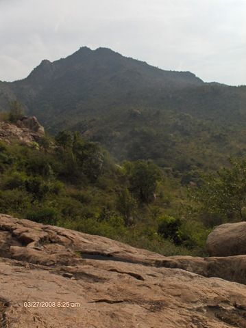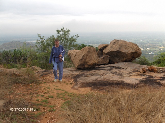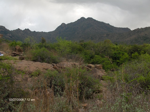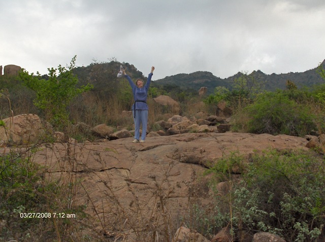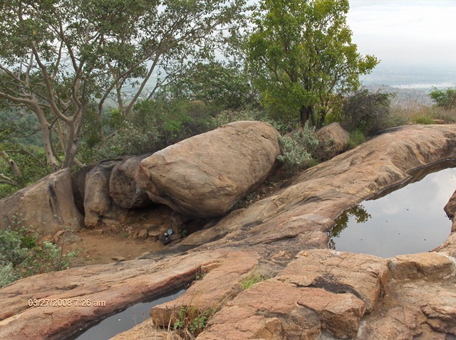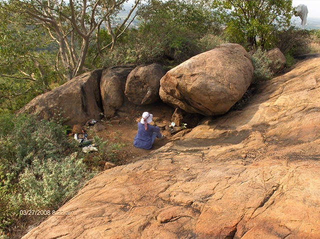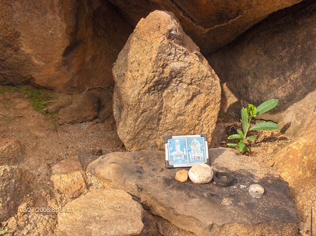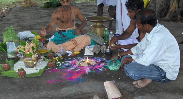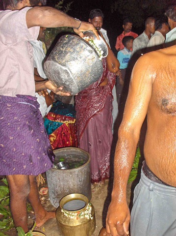 Then the priest formed a roll of flour dough and cut it into six pieces. He put dabs of turmeric and kum kum on top of 3 balls, and the sons combined each of these with the other three, forming three larger balls. Then there was the final trip to the water tank. This time both sons, as well as the daughter and another woman, got into the tank and immersed themselves, and the dough balls were offered and dissolved in the water. The ‘celebrants’ climbed out the steep rock walls of the tank, and then returned to the area under the tree temple.