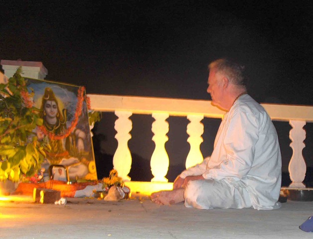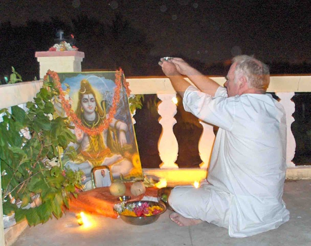 Now Anna performs the puja, again offering flowers and camphor. The the ‘gods’ are dressed up in dhotis.