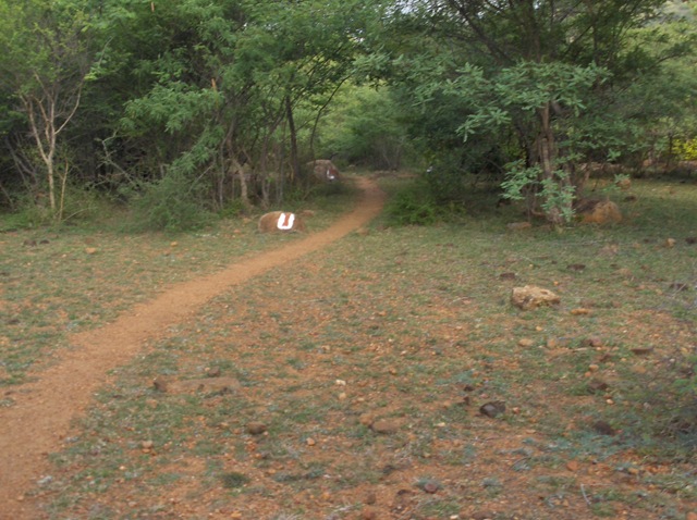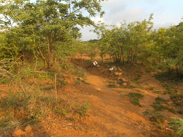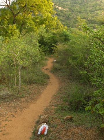 Winding through this countryside. The red and white paintings are trail markers painted on stones. These are found all the way around the mountain to mark the Inner Path. Following these one should not get lost – just keep Arunachala to your right and keep walking.