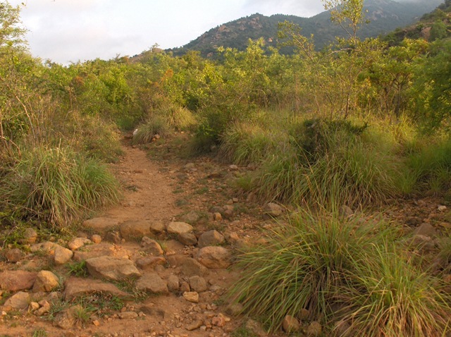 Continuing along the Inner Path. Now Parvati Hill, the small hill on the East end of Arunachala, with its two small peaks, is visible.