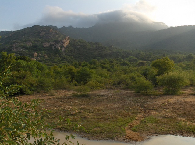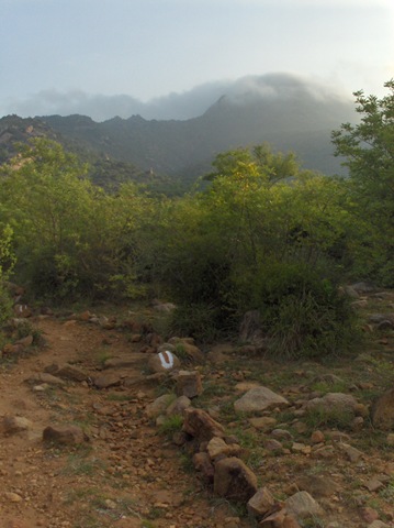 Again Arunachala in the clouds. This is from the berm shown above. Part way up the mountain, on the left side of the photo, a big rock formation is visible. This is where Aum Amma’s and Papaji’s caves are found.