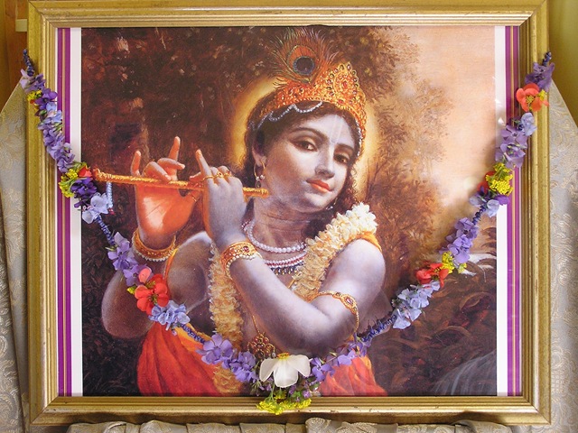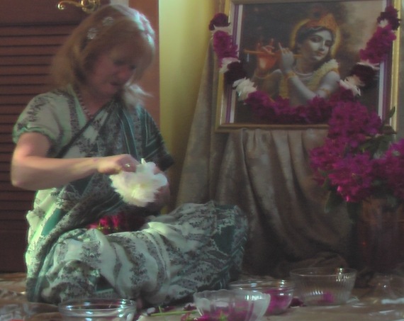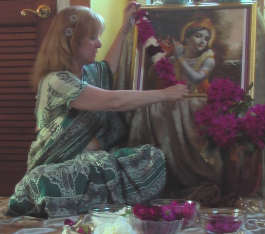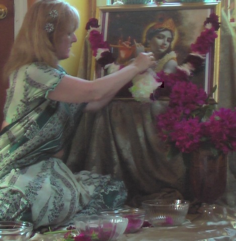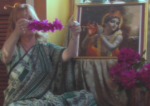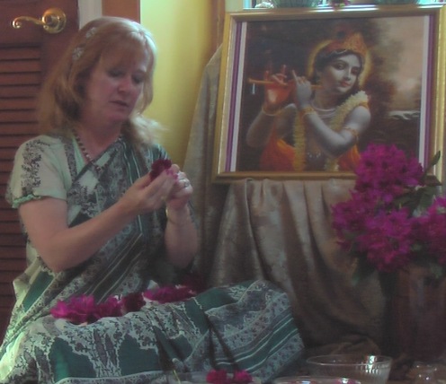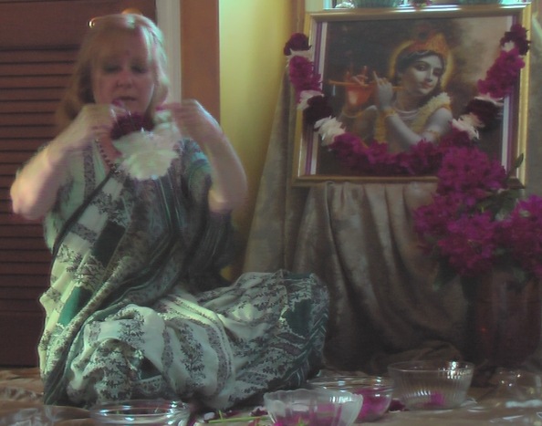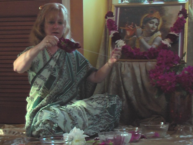 The photographs of Lord Shiva were taken by Bharatji, our unofficial temple photographer. You can see that I included the azaleas as well as roses someone brought in that evening. the azaleas are stitched sideways and the roses are stitched upright. This provides a beauty in variation of the direction of the flowers. I only made the mala shown on Lord Shiva’s chest. Someone else helped with malas that night and made the one crowning His head.