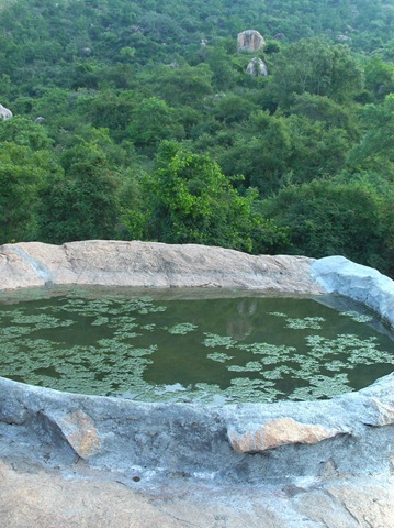 On the top of the rock over the cave, a cement water catching area was made. The photo below looks over this to the Arunachala hillside behind Kattu Siva’s cave.