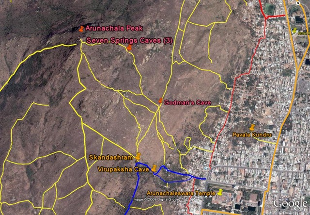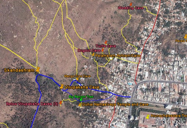 The map below shows all of the caves associated with Ramana, as well as other caves in the Virupaksha Cave area. Double click to expand.