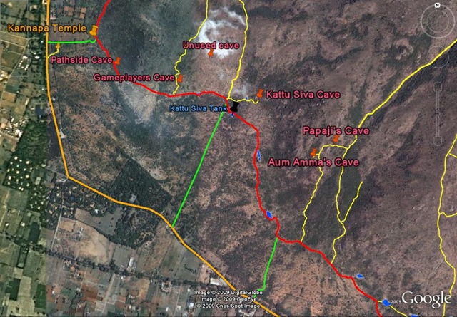 This map shows (right to left) Papaji’s Cave, Aum Amma’s Cave, Kattu Siva Cave, Unused Cave, Gameplayers Cava (Mankala Cave), and Pathside Cave.