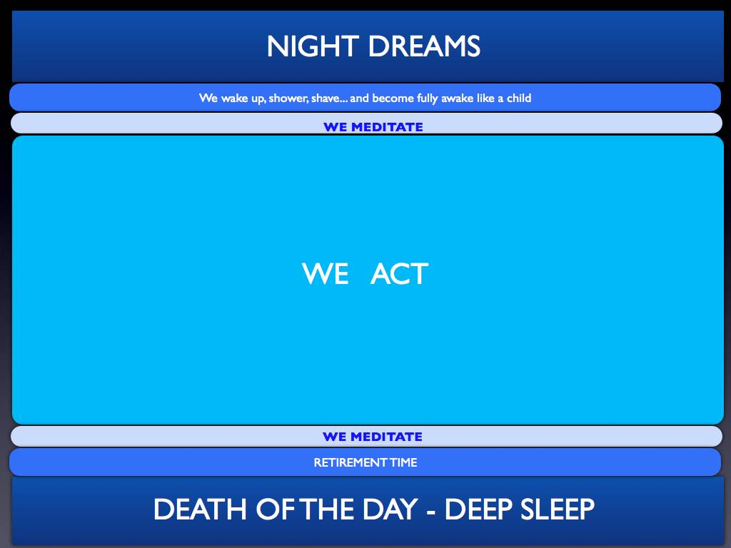 In this day we live in, we meditate and lead ourselves towards the universality, and then we start acting, which is our main part of the day, then as the day starts coming to an end, we meditate again, and perhaps dedicate some time to words of wisdom reading the scriptures or good books, or listening to a recorded satsang. Then we have dinner and as in a lifetime, we retire, we dedicate some time to our little ego before he is just about to dissappear in the deep sleep of the death of that day, to be born again the following day.