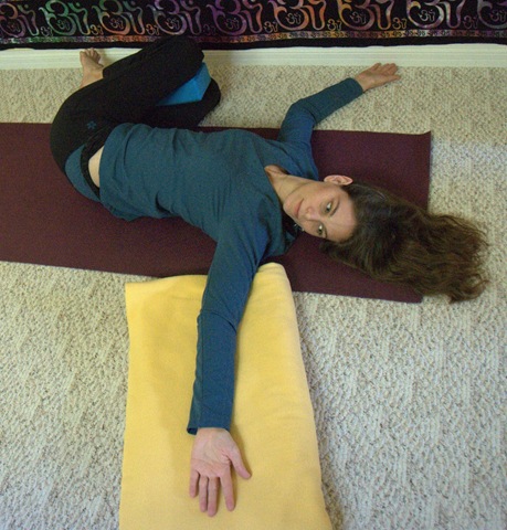 Lie on your back with some blankets and blocks near by. Roll to your right side, with your left knee bent, and your right leg straight. Rest your Left knee on a block or two, (or more as needed) so that the pose is now adjusted to the comfort level of your body. Shift the upper back to the floor, (or as close to the floor as you can) staying in your own comfort range. Rest your left arm on the floor, or a pile of blankets. Stay here for as long as you are comfortable, and then switch sides.