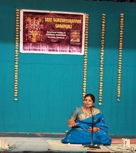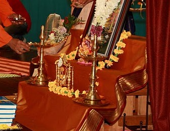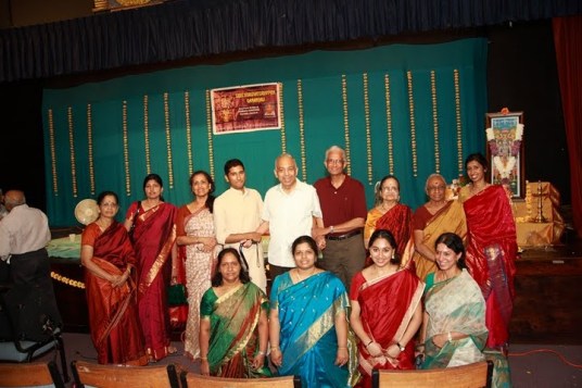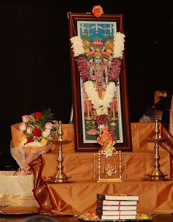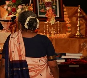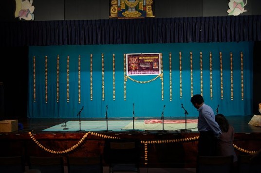 In thinking of it, I knew that they would not last until Monday for Rudrabishekam so I decided I would use them for Gananjali. Not knowing whether there would be any small murthies, it crossed my mind to make them for my hair, as I seen women do at other concerts in the past. In the car on the way, with our driver driving faster than the speed of light, I discussed options with Bhadra, who was sitting next to me. Marvelling at my own ability to stitch in such speedy conditions, I then made one small mala, using all of the blooms. I put it in my purse, still not knowing what it would adorn. The program had not yet started when we arrived and I looked around for Sreedeviji and Sundara Narayana. The room was bustling with activity, microphones still being set up and people coming into the room to be seated, chatting to each other as they waited for the signal that the program was about to start.