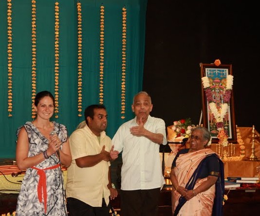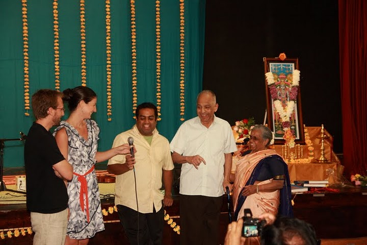 And then there was Sundara Narayana Uncle, who spoke a few words, quite an achievement in light of his recent stroke. As Sreedevi Aunty told me: “These were his own sentences, which Emily, the speech therapist printed out and he read from there.” He said, ” Hari Om. Welcome to you all. Lots of things have happened in the last few months, some of it good, some of it bad. All according to God’s will. All are prasadam to me. My wife and two wonderful kids, I have are given to me by God. I am blessed with wonderful family and friends. I am also blessed to know my wonderful speech therapist, Emily Sweet and her husband Eric.”