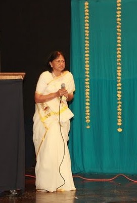 At the same time this thought ruled the day, I looked up onto the stage and saw the woman who I knew must be Sreedevi auntie standing there with some others near the pujya. I rose from my seat and went up to the front of the stage. Since we only knew each other from the Guruvayur group and had never met, as I looked up and she looked down I asked the silly question…”Do you recognize me?” She laughed and told me that of course she did. I handed her the mala, trusting that it would find its way to where it belonged.I went back to my seat and began chatting with Bhadra. When I looked up I saw that Sreedeviji had walked across the stage with the mala hanging from her wrist. I wondered what she would do with it!
