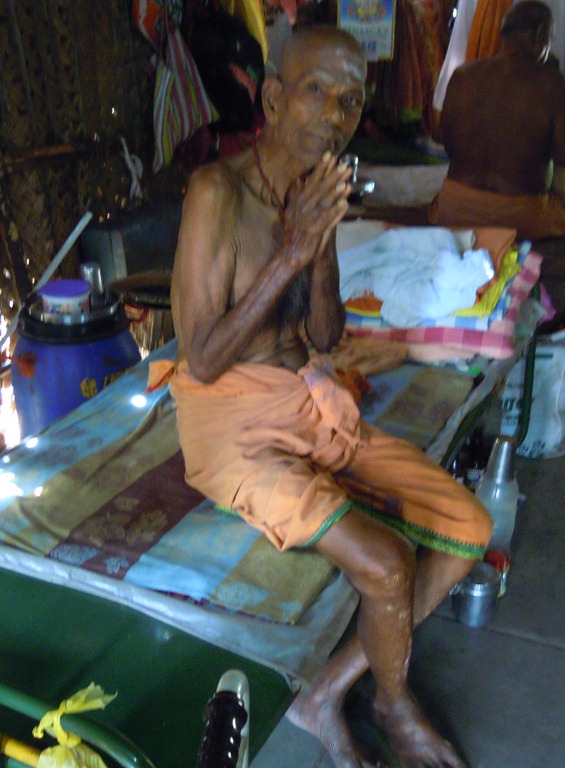 Outside, Dhakshinamoorthy talks with one of the healthy sadhus who stays near here. He has taken it upon himself to try to help these old sadhus, even though he has nothing himself. There is another sadhu who helps, too. He is not here today, because he has taken one of the old sadhus to a nearby hospital for emergency treatments.