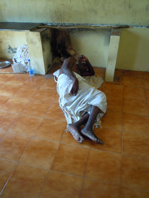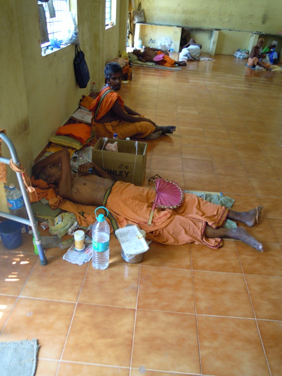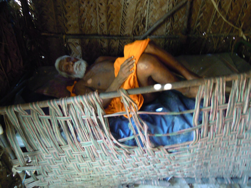 Another sadhu lies in bed. From the emaciated look of his body, regular feedings will help him.