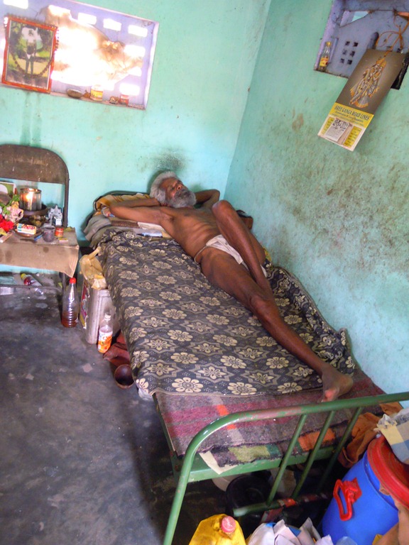 Standing in front are Dhakshinamoorthy and the young man who will be bringing the food here each day. The man sitting on the cot closest to Dhakshinamoorthy is Ramesh, who assists in the running of Quality of Life Trust.