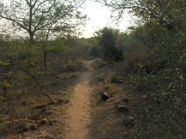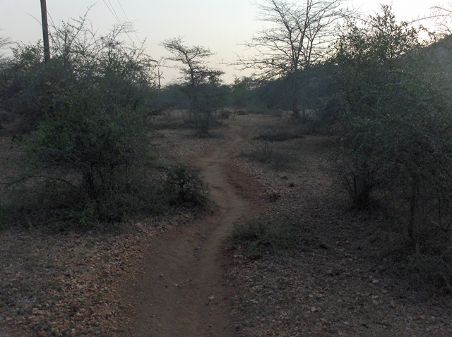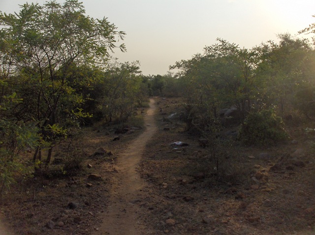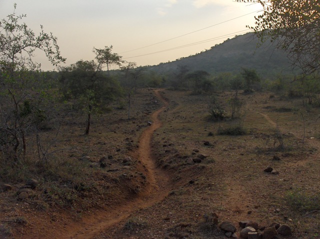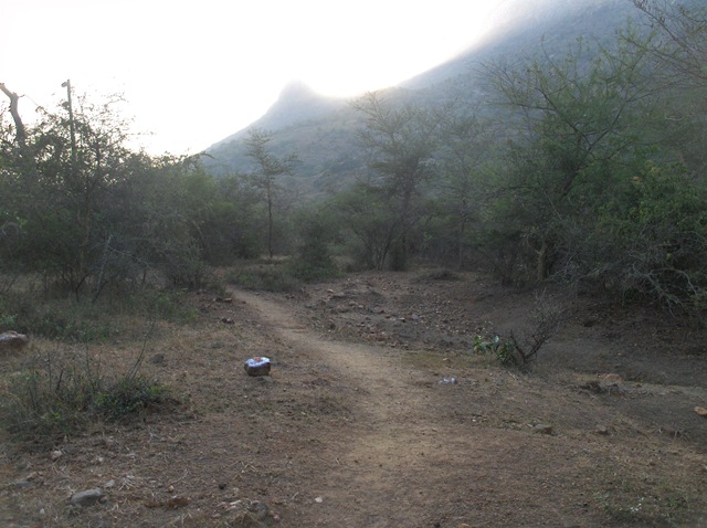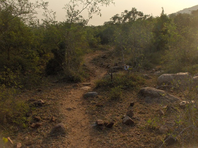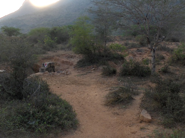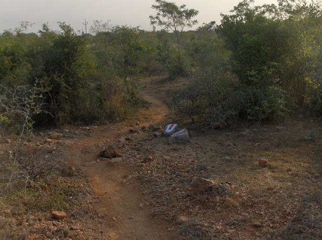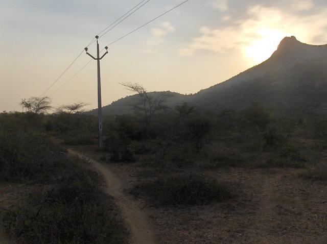 The final section of the Path goes for a bit through trees and brush, near to (but not visible from) Pradakshina Road. It then goes behind a few houses of local villagers, then up a small hill to Pachaiamman Koil, then down the hill back to the road. And the way we walk, finally to Ramakrishna Hotel for breakfast of Indian coffee, vadas and dosas.